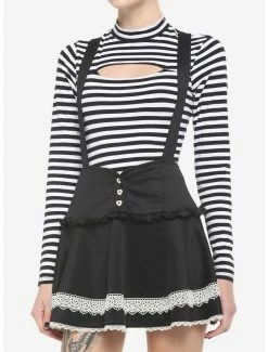 Bring the energy of a little black dress, but in suspender skirt form. This style has a heart-shaped waist at the front, with faux heart-shaped buttons. There is also white lace at the bottom hem. Adjustable straps.
