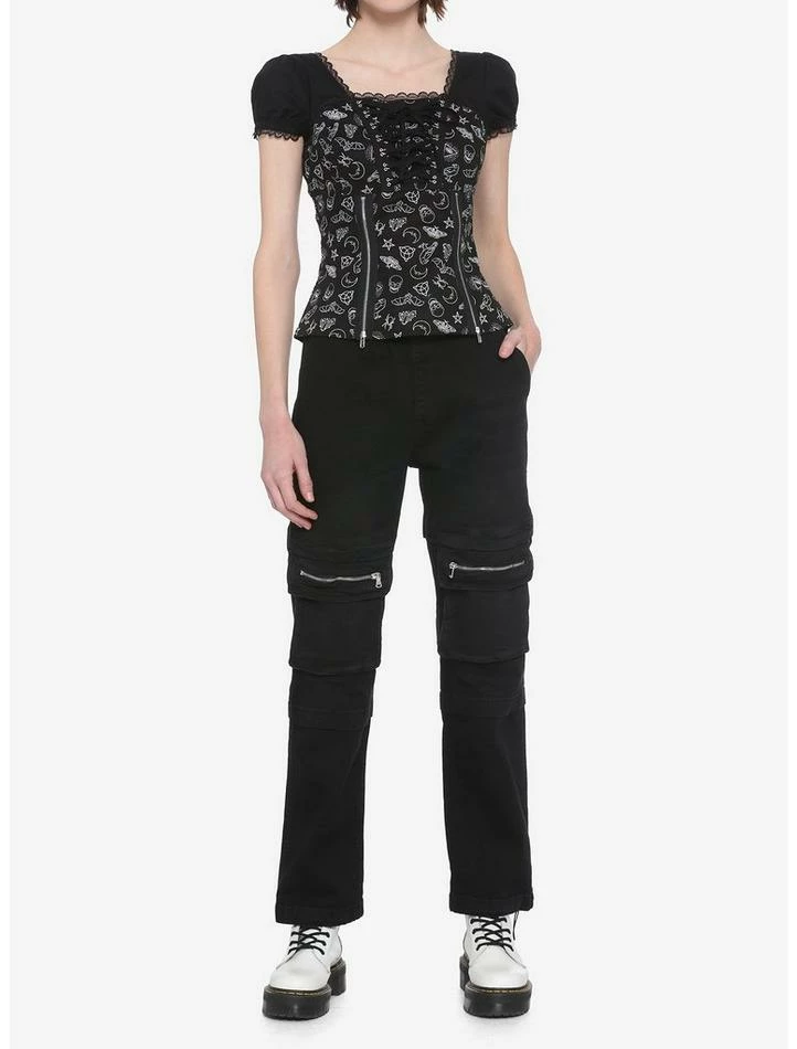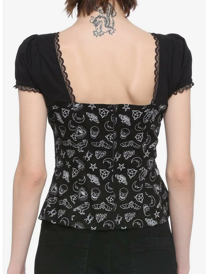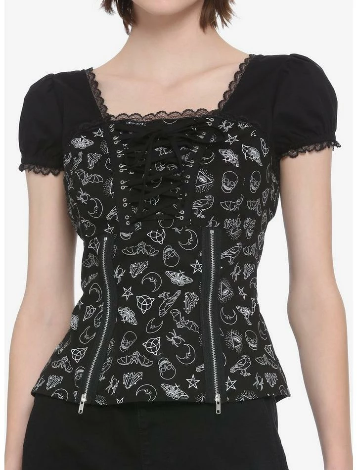 Get more magic in your life with this witchy lil’ number. Printed on the bodice with white witchy symbols such as bats, pentagrams, skulls and more. The black sleeves have lace trim to match the neckline, with decorative zippers on the waist and adjustable lacing across the bust. Featuring a center back zipper closure.