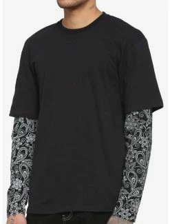 Feelin’ those dark cowboy vibes? Then this twofer is for you! Featuring a black and white paisley print on the sleeves.