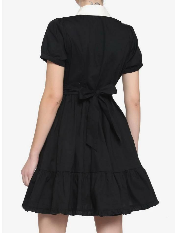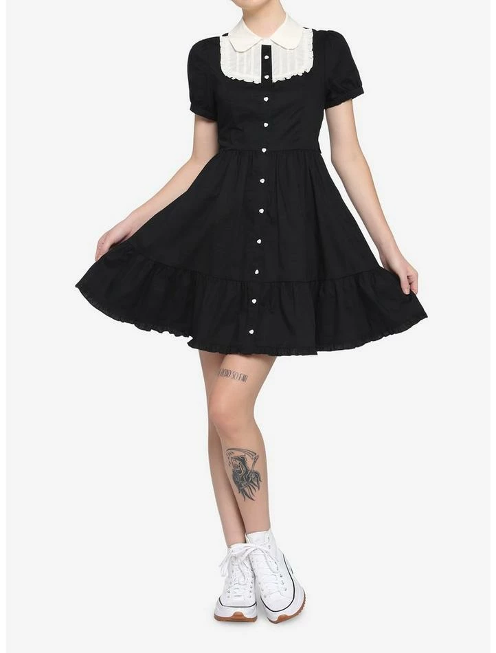 Add a timeless look to your dress collection with this peter pan collared dress. It has so. many. features: adorable heart-shaped buttons, puff sleeves, bib detail, pockets and removable ties at the back for that perfect fit. This piece will never go out of style.