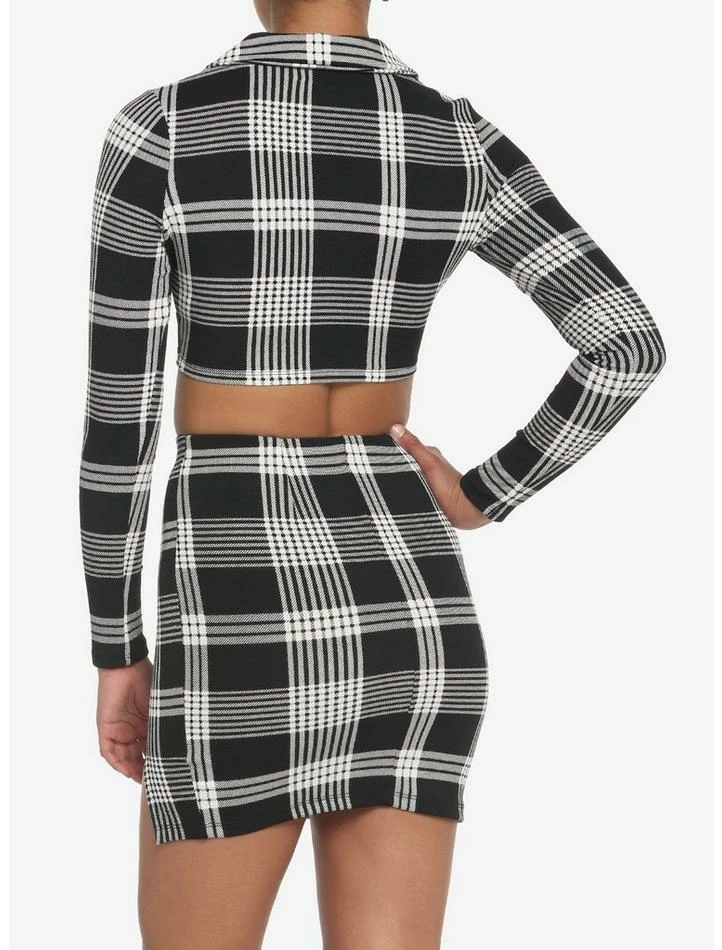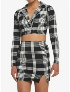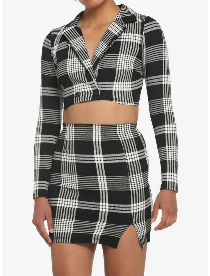Channel your inner valley girl with prep school vibes in this white and black plaid set. Featuring a cropped blazer with functional double button closure, and a mini skirt with a front slit and elasticated waistband.