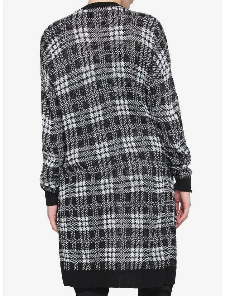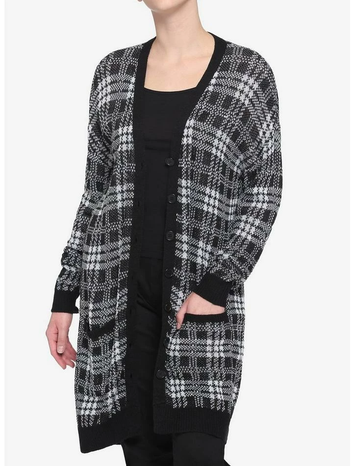 Stay cozy AND stylish in this lightweight, oversized cardigan. Featuring a black and white plaid pattern, a button closure and front pockets.ย