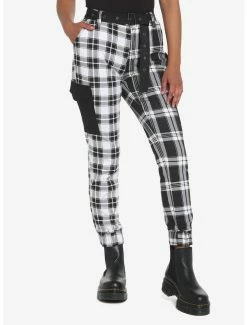 Two plaids for the price of one! These jogger pants feature split plaid patterns of black and white, as well as a removable grommet belt and front pockets and side flap pockets.