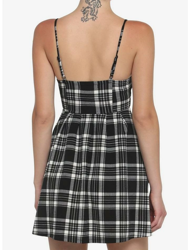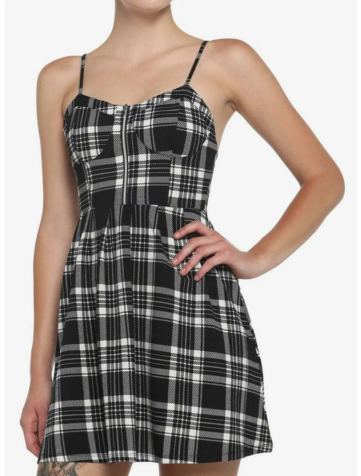 The perfect staple piece in your closet! This dress features a black and white plaid print, adjustable spaghetti straps, front zipper detail and pockets.