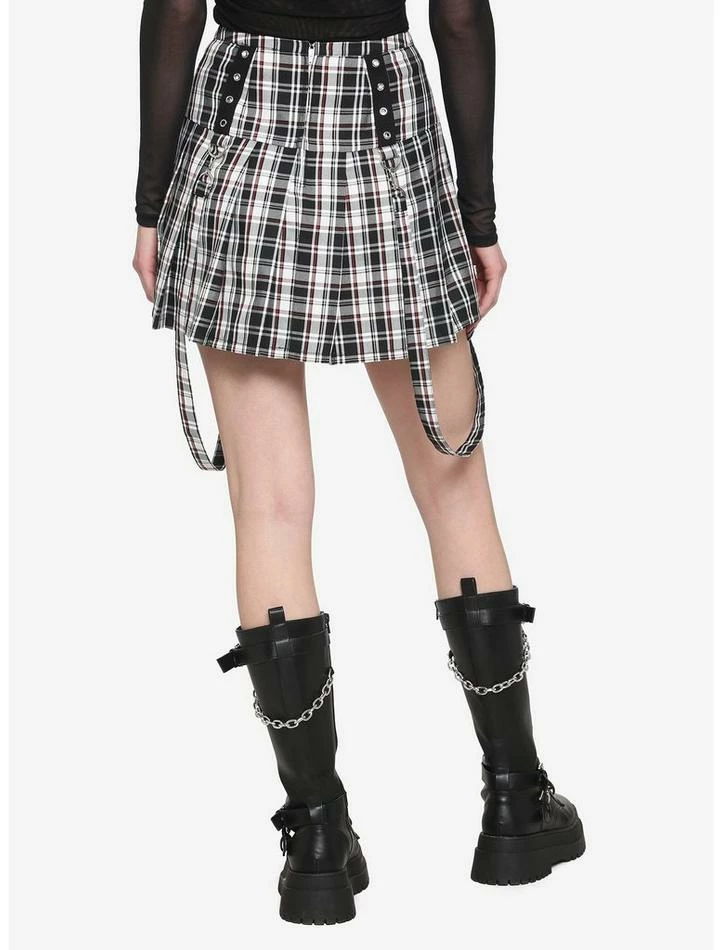 Warmer weather means time for new skirts! This one features a black, white and red plaid pattern, grommet detailing, pleats, removable suspender straps and back zipper closure.