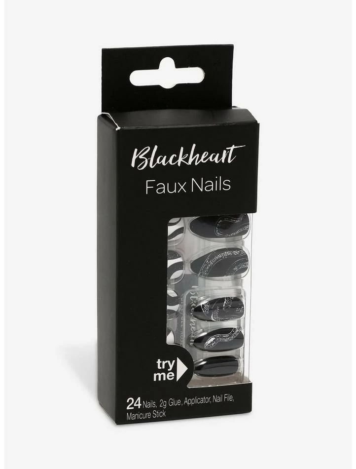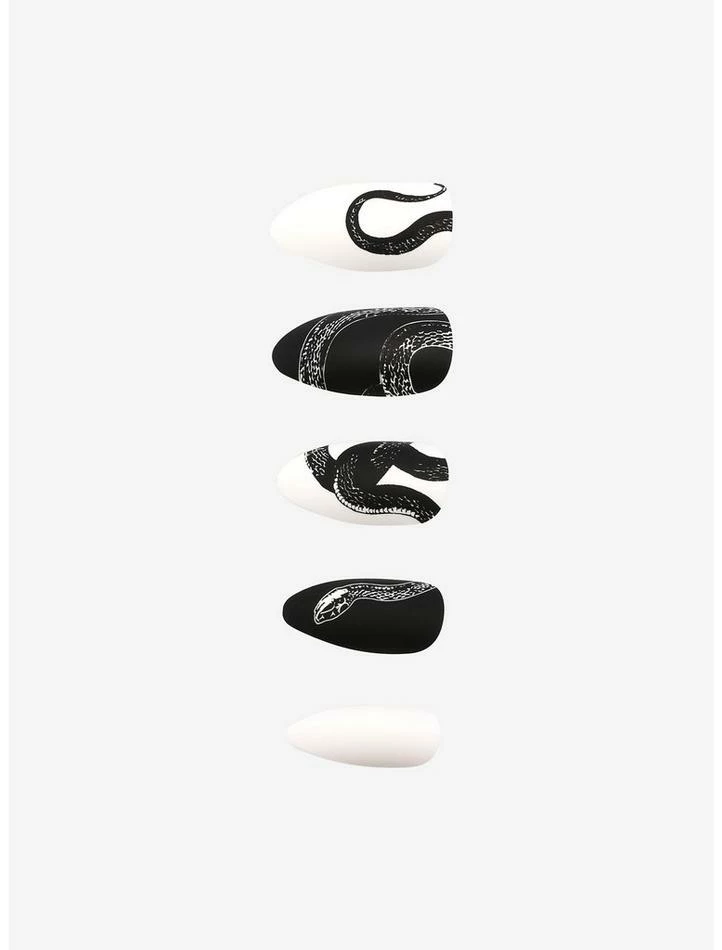 Looks like a new set of nails have slithered into your collection! This black & white faux nail set features snake designs and contrasting black & white nails. Comes with 24 nails, 1 tube of nail glue, an applicator, nail file and a manicure stick.