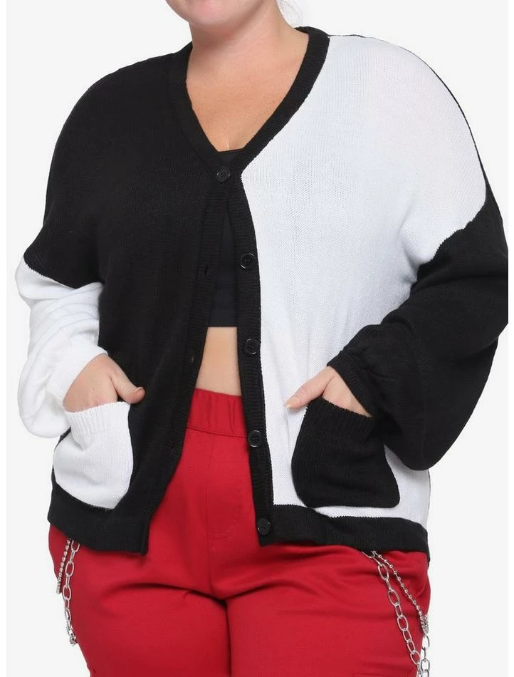 Divided on what to wear? If you’re of two minds, get yourself a cardigan that caters to both! This black and white cardigan features a button front and pockets as well as a black and white split, color-blocked design.