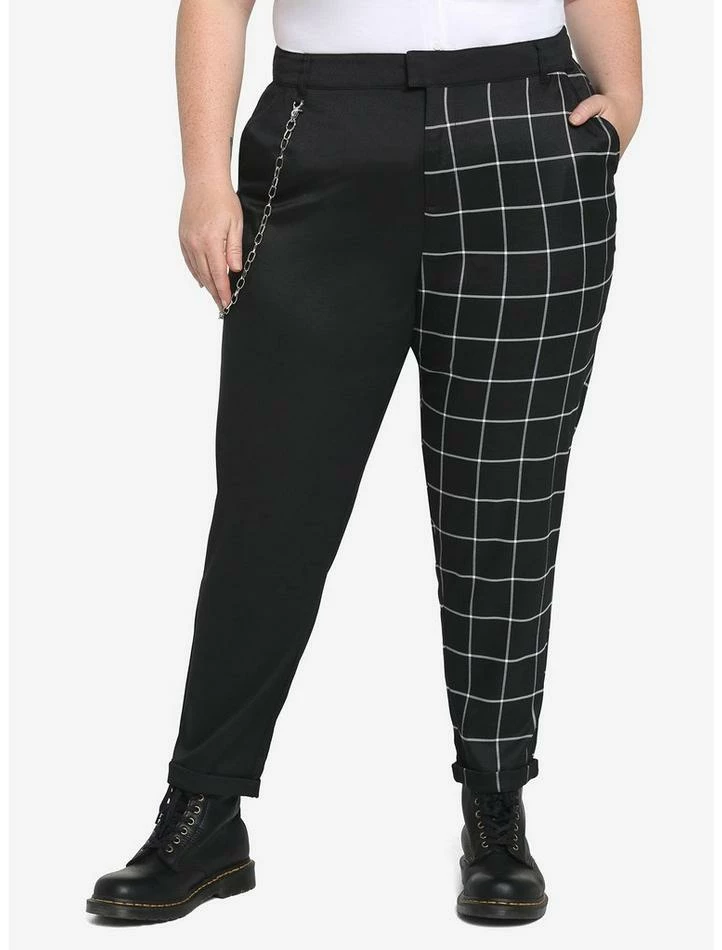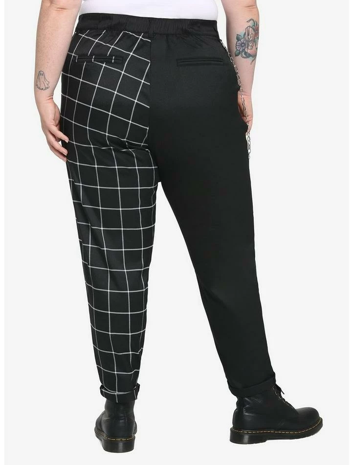 Rock both solids and patterns with these black, split leg pants! Features a white grid print on one side and a removable, silver-tone chain on the other. Comes with hip pockets and a half elasticated waistband.