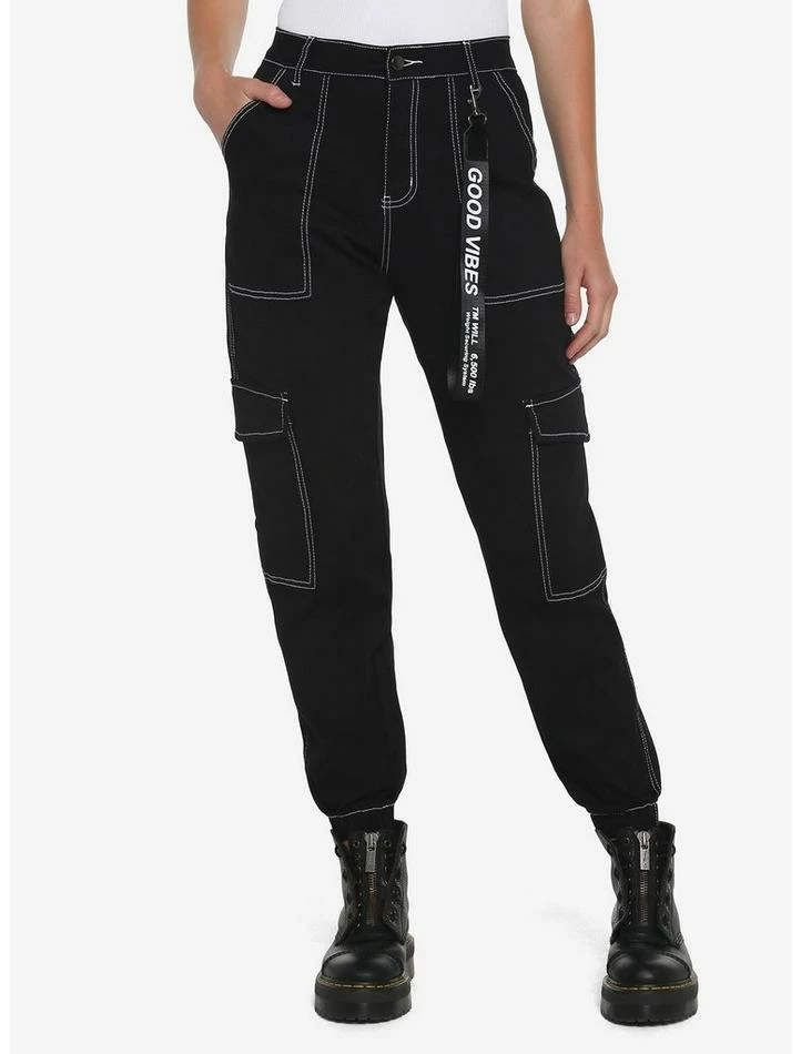 Add more looks to your streetwear collection! These black jogger pants feature white contrast stitching, plush hip, back and cargo pockets. Comes with a removable “Good vibes” tag and a button and zipper closure.