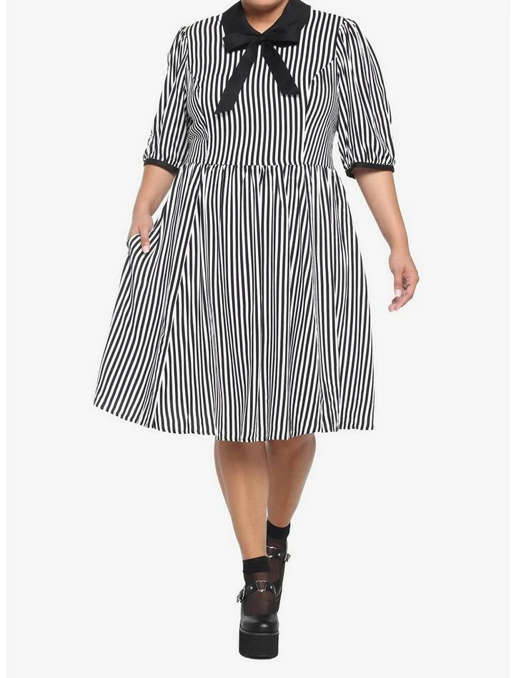 It’s practically written in black and white: YouΒ needΒ this dress in your wardrobe! Feel classy while bringing those dark, mysterious vibes to your look in this black and white striped dress! Featuring elbow-length puff sleeves, a black Peter Pan collar and a removable black tie around the neck. Complete with side seam pockets and a back zipper closure.