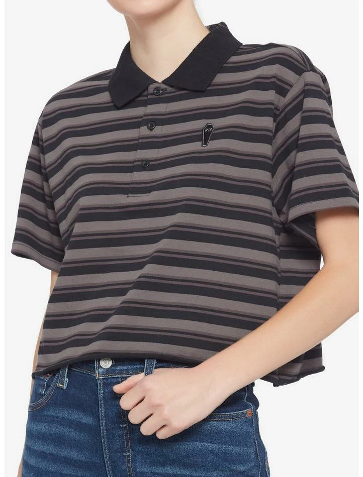 This top is gonna look dead cute with your black skinnies and combat boots. The black and white striped polo shirt features a tiny coffin on the left chest, a functional front buttons and raw hem.
