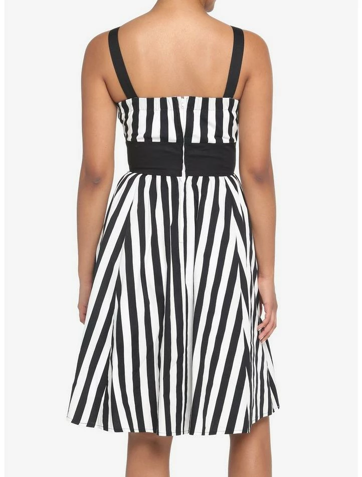 Get the gothic striped look, but make it classy. This retro dress features a black and white striped pattern and comes with corset-inspired lace-up detailing under the bust. Complete with a half elasticated back, back zipper closure and pockets!