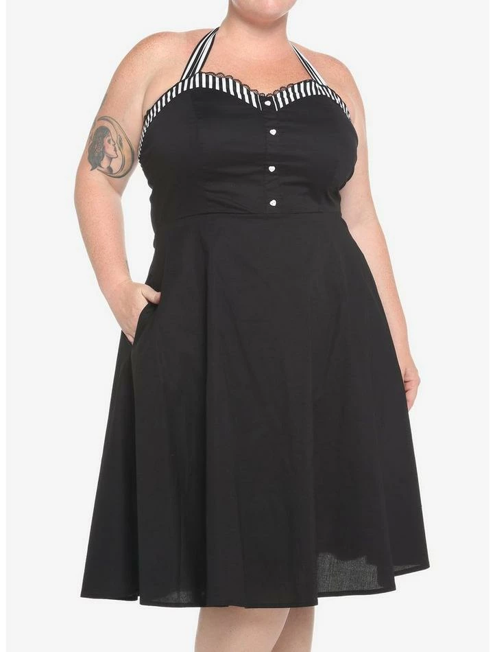 Throw it back with this retro-style little black dress! It has a halter neckline detailed with black-and-white striped fabric and lace, plus heart-shaped buttons down the front bust and just the right amount of stretch.