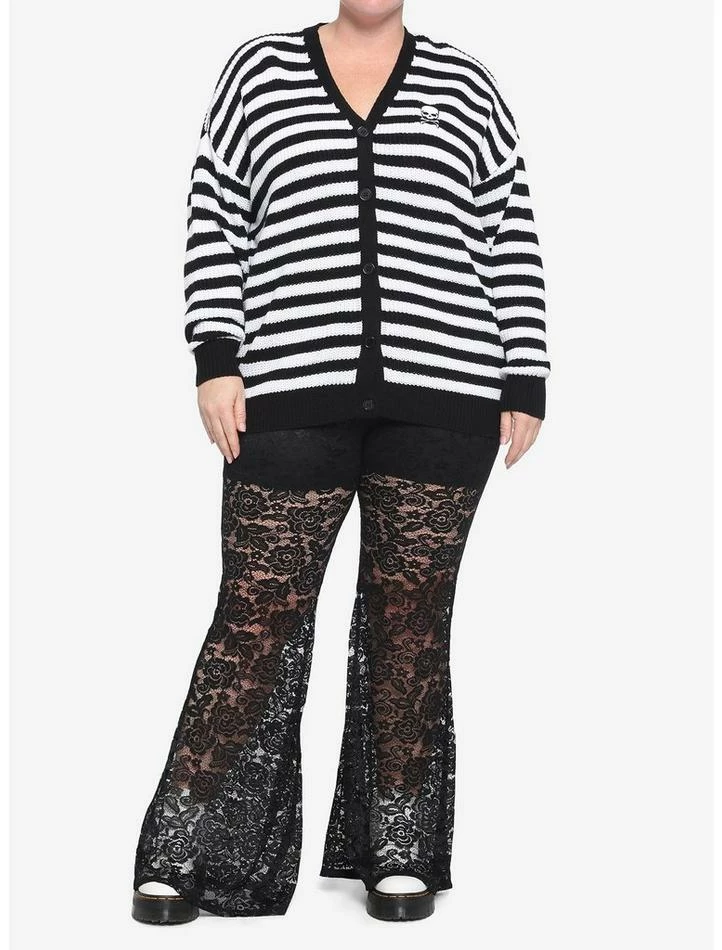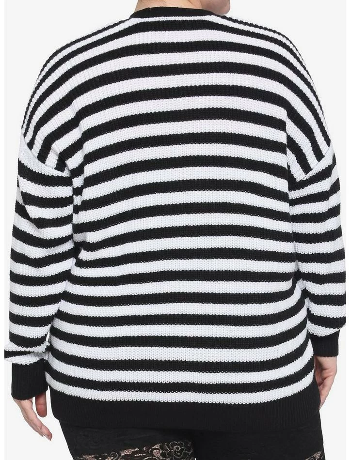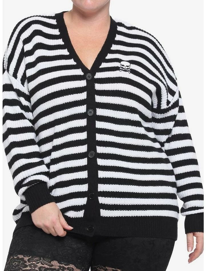 Best season? Cardigan season! This one features black and white stripes, a skull patch, buttons down the front and an oversized fit.