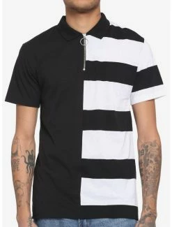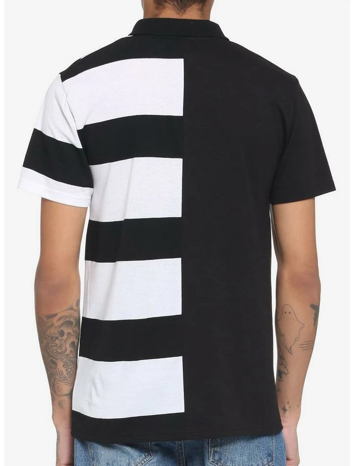 Plain polos are boring. Try a split shirt instead! This polo features a split design of solid black on one side and black and white stripes on the other. For some extra edge, there is a front partial zipper with an O-ring zipper pull.