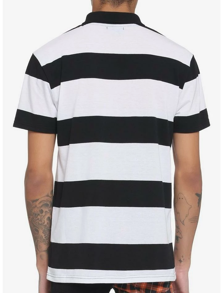 Plain polos are boring. Wear stripes instead! This black and white striped polo features a front partial zipper with an O-ring zipper pull and a black collar.