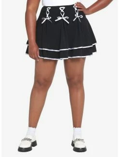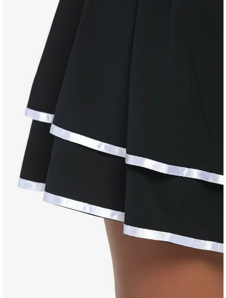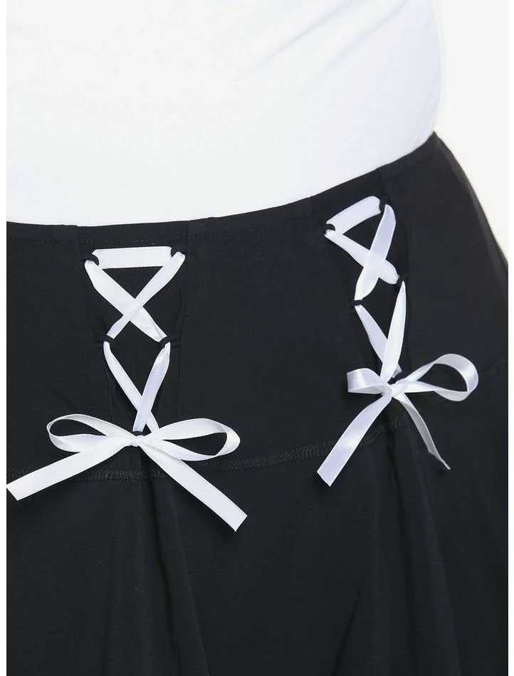 Add a new piece to your rotation with this black skirt featuring triple white lace-up detailing on the yoke, white ribbon trim, tiers and back zipper closure.
