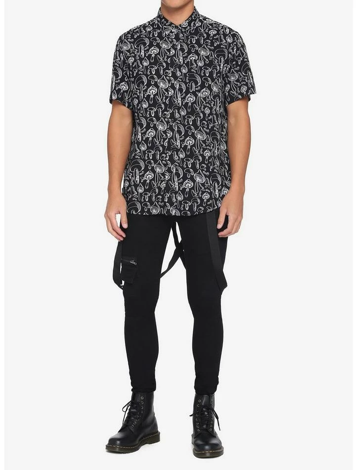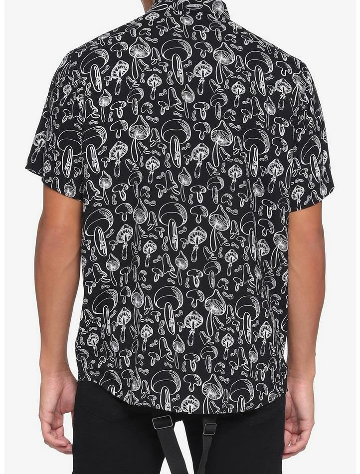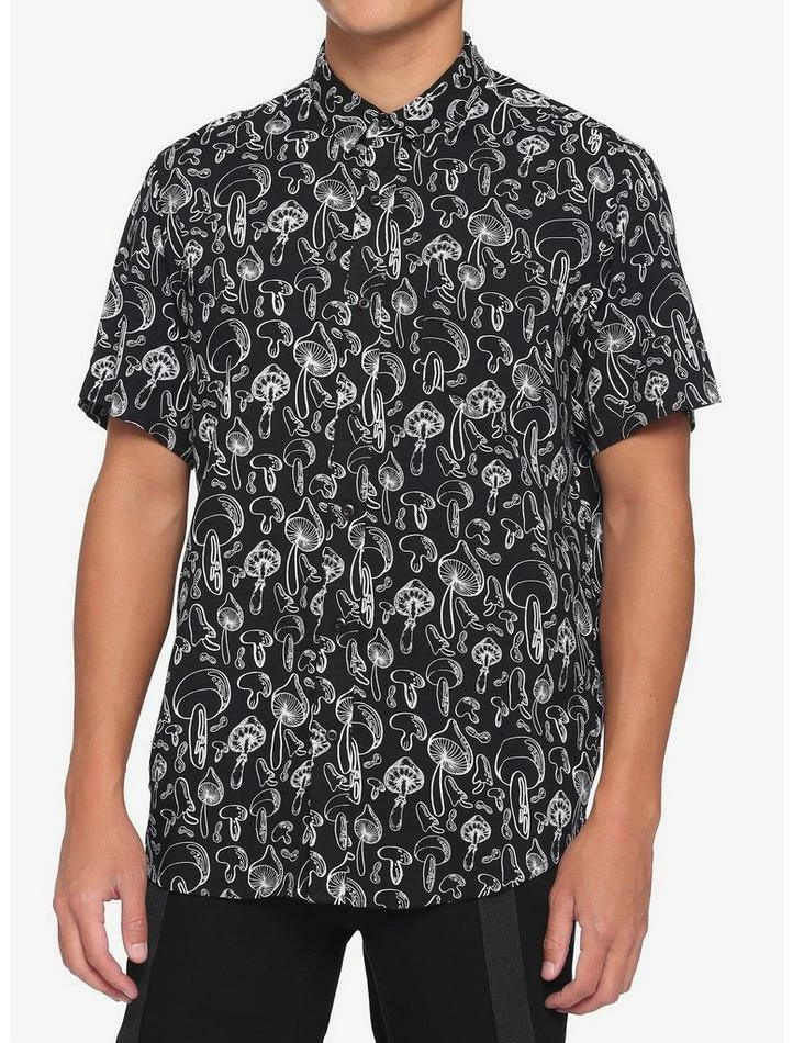 2021 is the year of the ‘shroom boom. Face it – mushrooms are in! So, if you want to look like a real “fungi,” try this shirt on for size! Black collared button-up features an allover pattern of white outlined mushrooms.