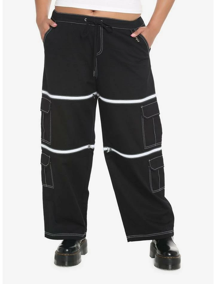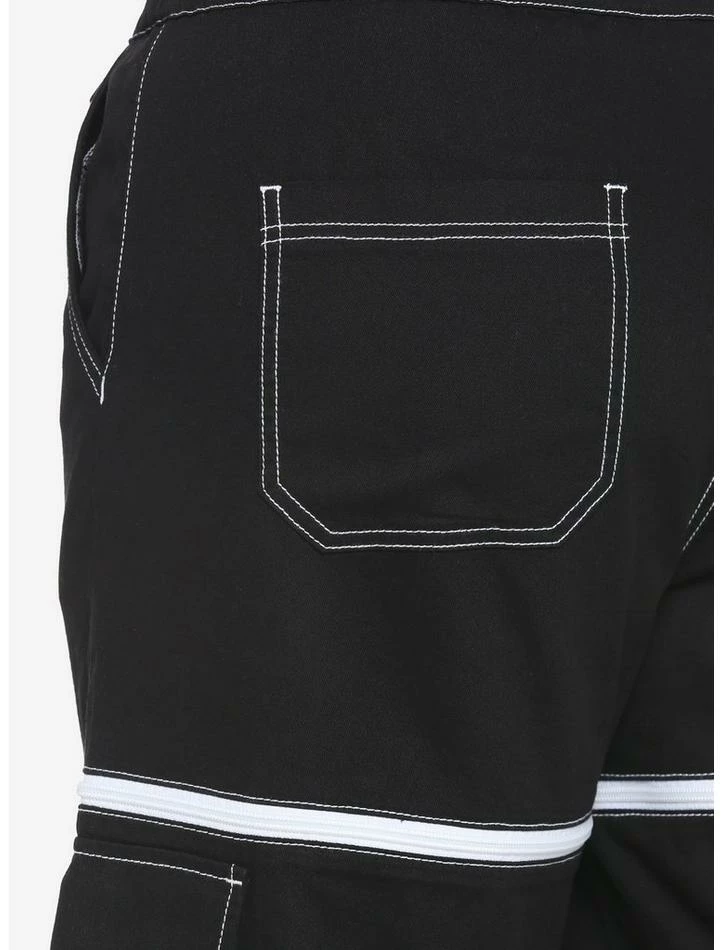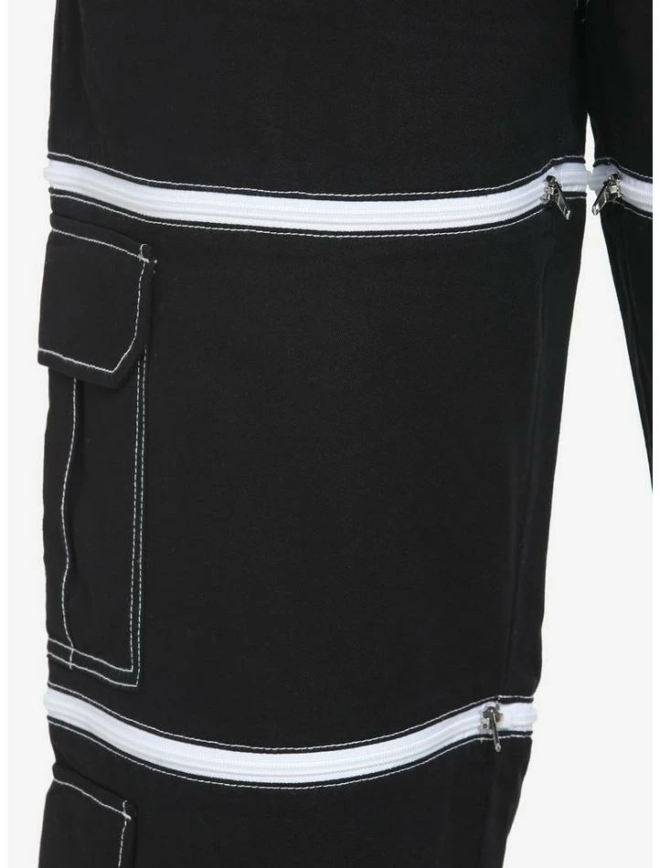 These black carpenter pants are perfect for any weather! They come with two white zip-off sections to adjust the length to your liking. Complete with hip, back and cargo pockets and an elasticated drawstring waistband.