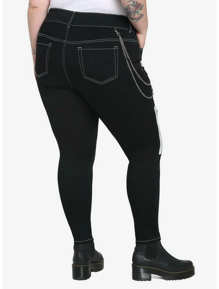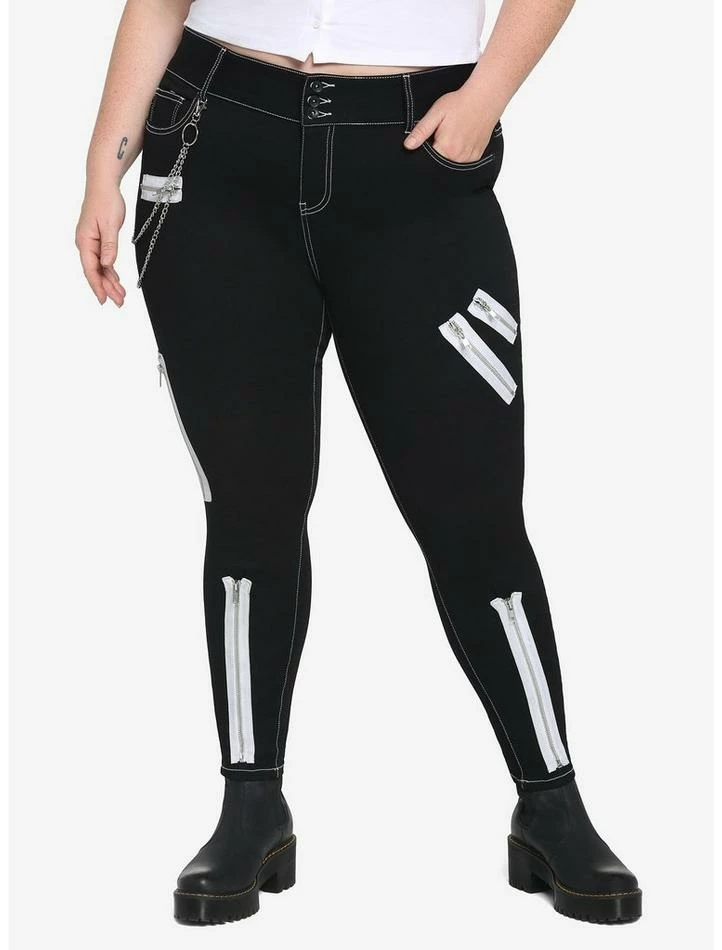 Who said skinny jeans were out of style?! This black pair features white zipper detailing on the legs and come with a removable, silver-tone double chain at the hip. 5-pocket styling and triple button and zipper closure.