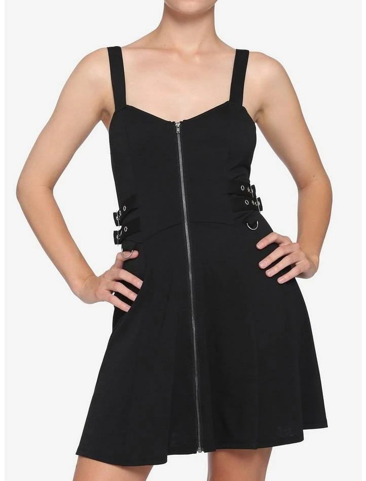 Look downright strapping in this number! Black strappy dress features stretch fabric, functional front zipper and removable suspender hardware.