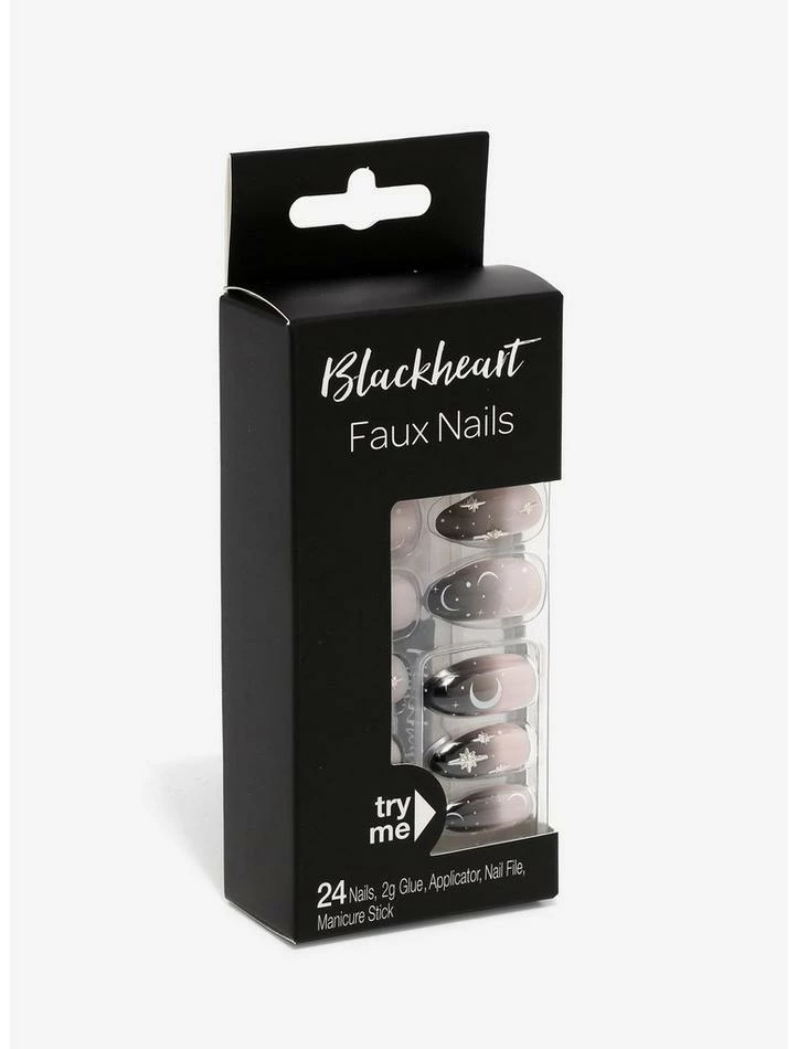 Nothing completes a look like a cute mani! Make your witchy dreams come true with this mystifying faux nail set! Featuring celestial-themed designs over a nude and black, ombré background. Comes with 24 nails, 1 tube of nail glue, an applicator, nail file and a manicure stick.
