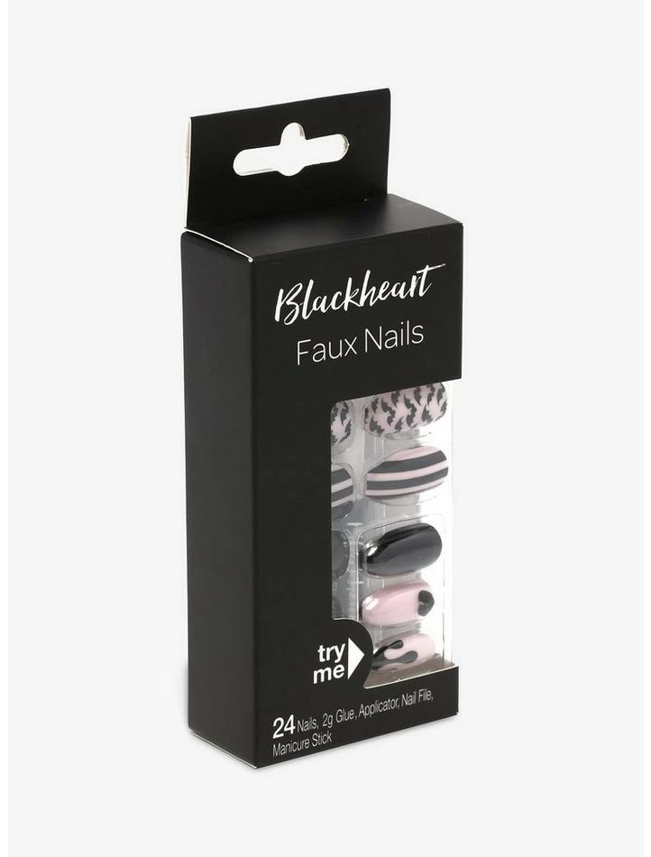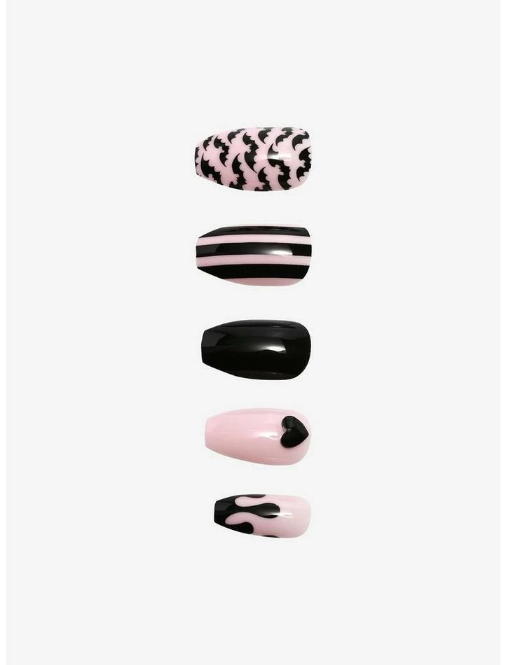 Nothing completes a look like a cute mani! Make your pastel goth dreams come true with this supercute faux nail set! Featuring pastel pink and black designs, including stripes, bats, drips and more! Comes with 24 nails, 1 tube of nail glue, an applicator, nail file and a manicure stick.