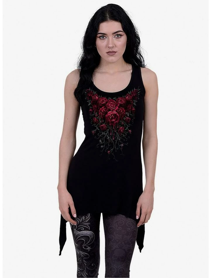 A beautiful garland of gothic roses, but look closely, is that blood? This handkerchief sleeveless tunic top is made of jersey using skin friendly, Azo-free, reactive dyes.