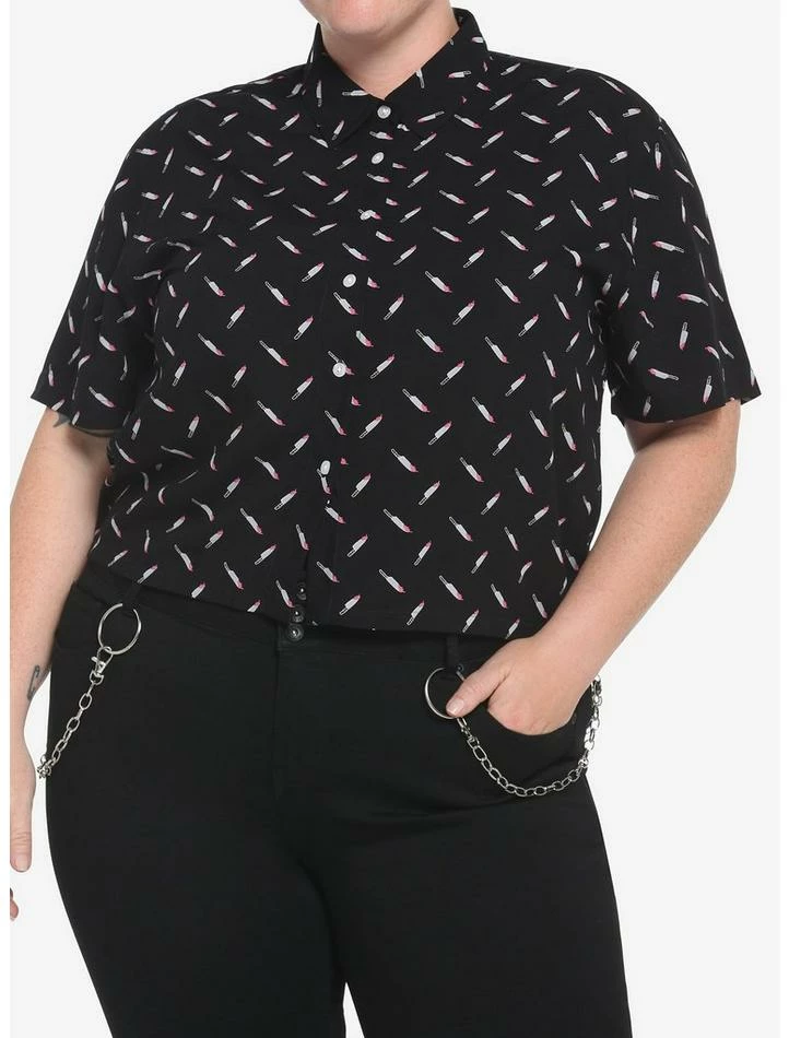 Step out with deadly style! Slay all day in this black woven button-up. It has a boxy, cropped fit and features an allover print of knives with pink blood.