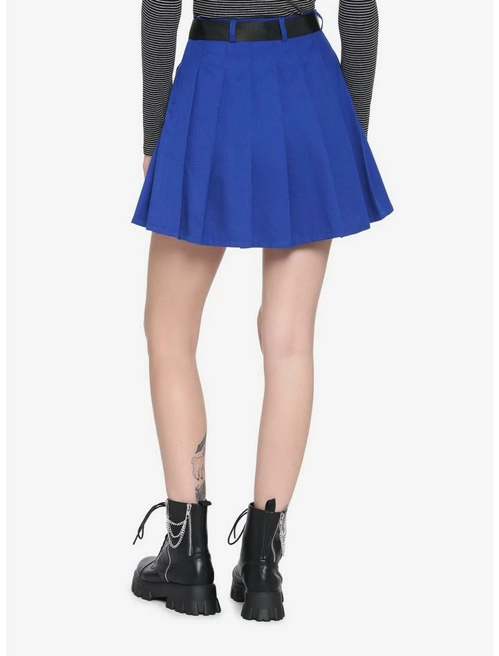 Level up your skirt game with this blue skirt, featuring a black buckle belt, side zipper closure and pleats.Β