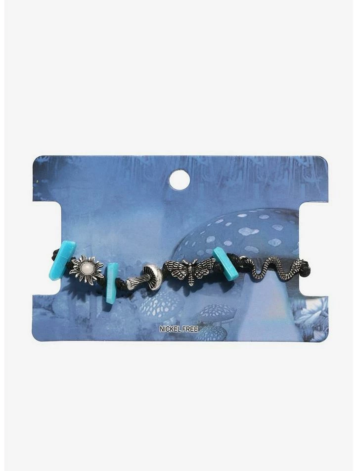 Channel all of the forest’s mystical energies to your jewelry collection! This cord bracelet features charms of faux blue crystals throughout, with forest-themed charms of a snake, moth, mushroom and sun in between.