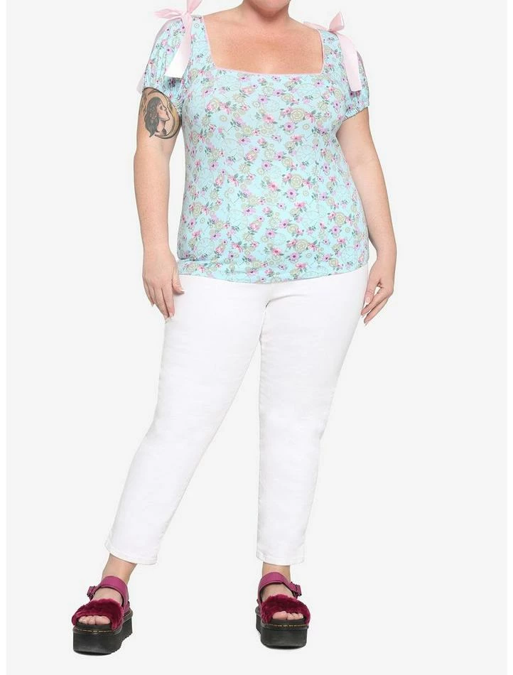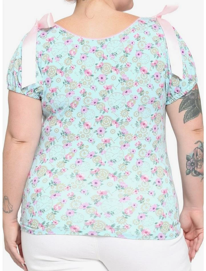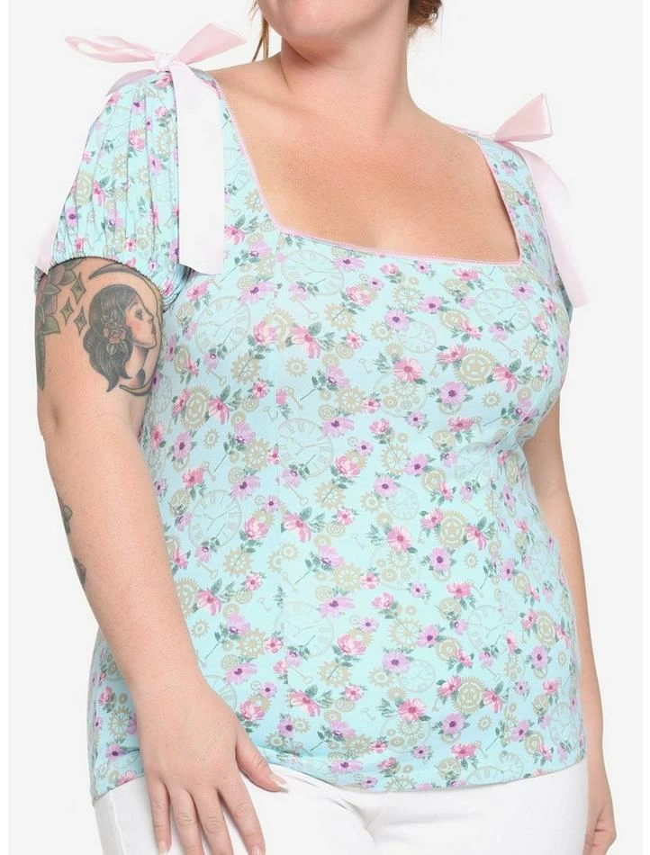 For a spring steampunk vibe, try this cute top. It puts a twist on your traditional florals and adds in clocks, gears and keys to the print. Features satin ribbons on the shoulders, a square neckline, puff sleeves, princess seams and just the right amount of stretch.