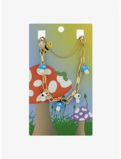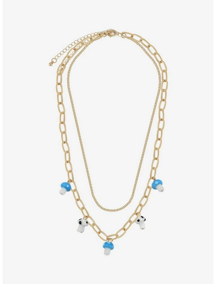 Do mushrooms count as bling? We think they do! This multi chain necklace features a chunky gold tone chain with blue and white mushroom charms and a smaller gold tone accent chain.