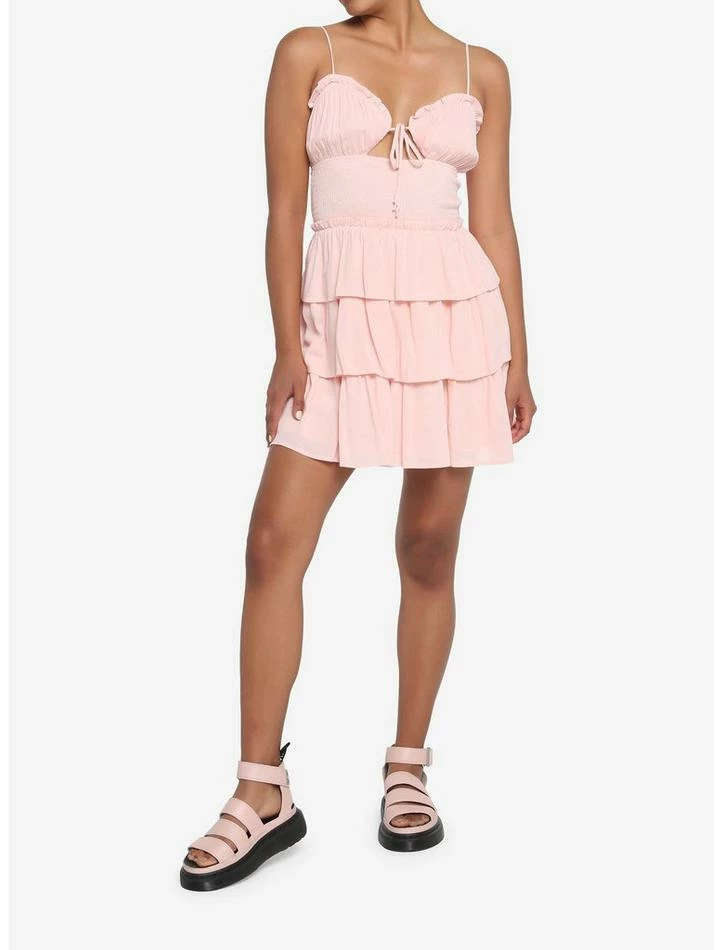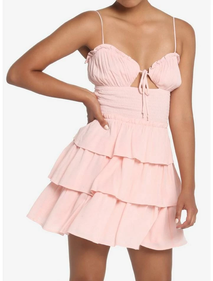 Get ready to twirl in this blush dress featuring a keyhole detail, tie on the front and tiered skirt.