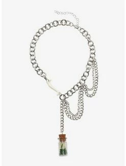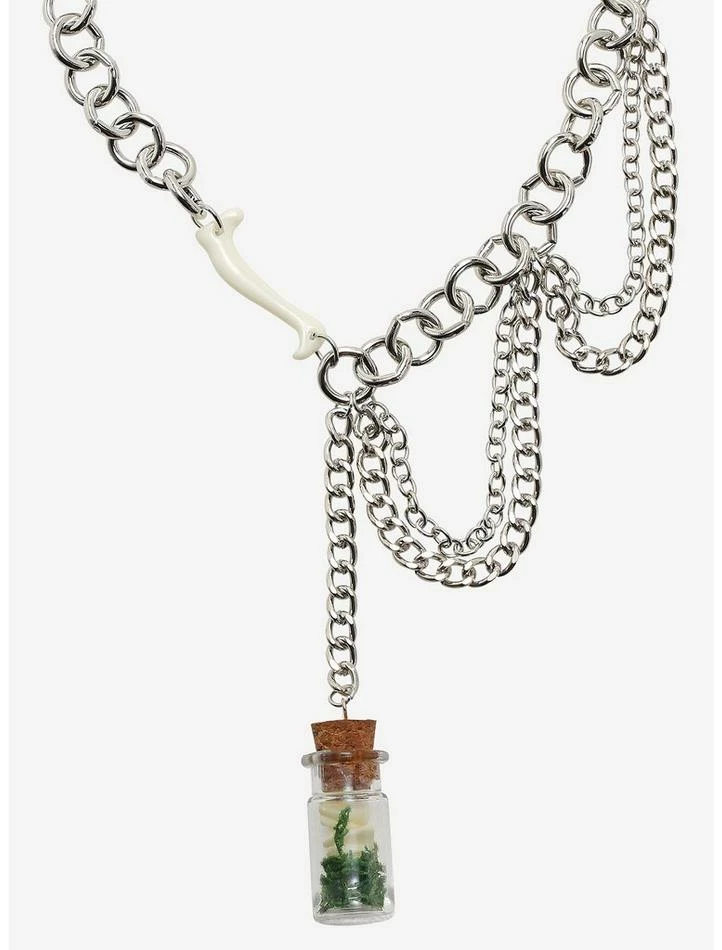 Jewelry collection feeling a little bone dry? Here’s a statement necklace to shake things up! Add some edge to your look with this chunky chain necklace, featuring a bone charm and a dangling capsule full of teeth and greens, plus layers of silver-tone chains on the side for a dynamic look.