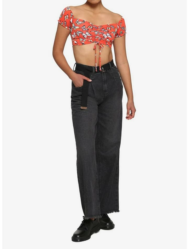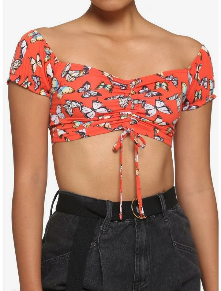 This trendy top is giving us some serious butterflies! Rock this bright crop top this summer, featuring ruching and lace-up detailing at the bust. Comes with off the shoulder, elastic sleeves.ย