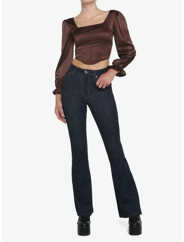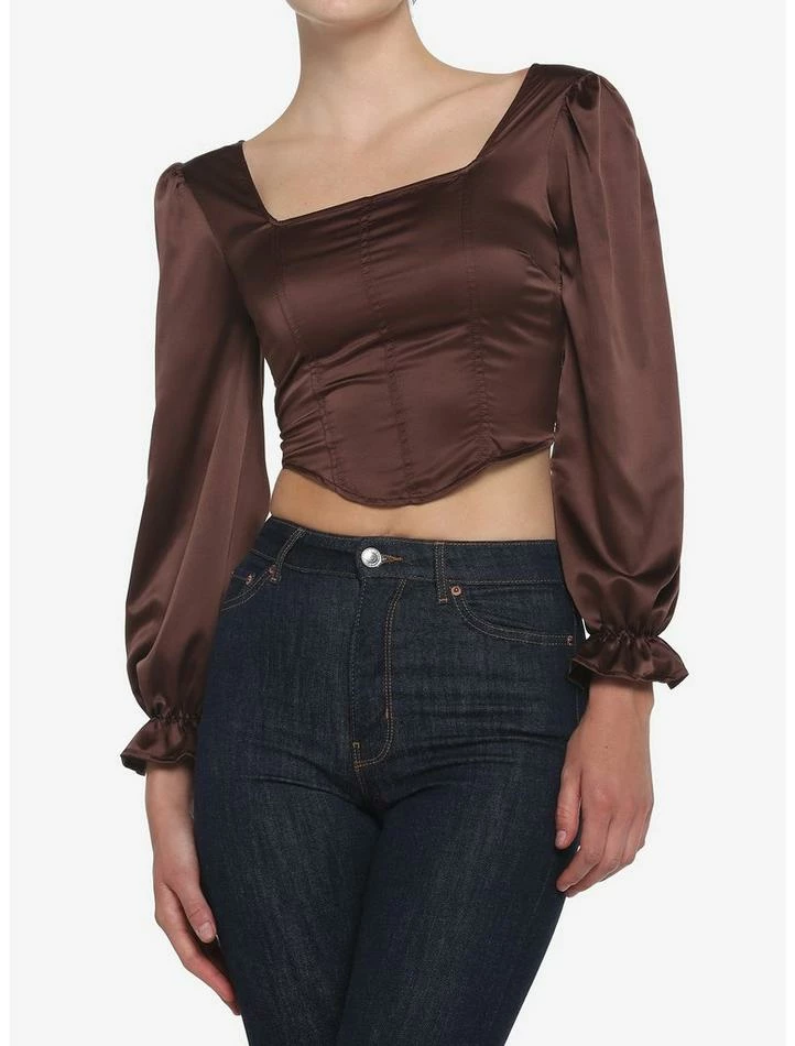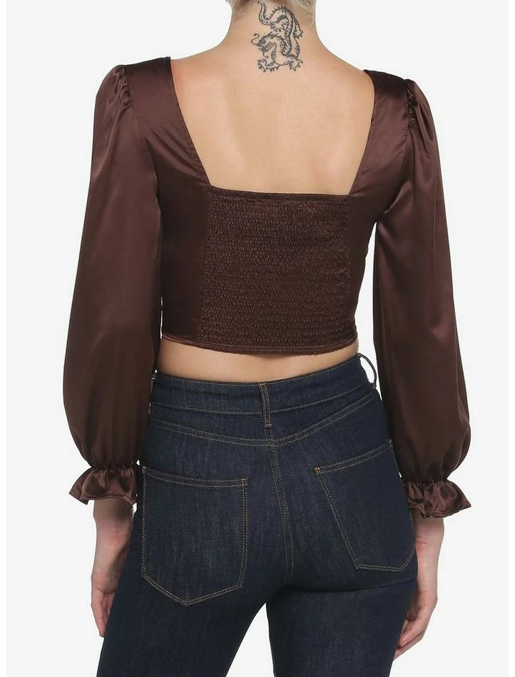 Add some romantic vibes to your closet with this brown, long-sleeved top! It has a cropped length and features a corset-inspired bodice, with smocking on the back. Complete with a square neckline and puff sleeves.