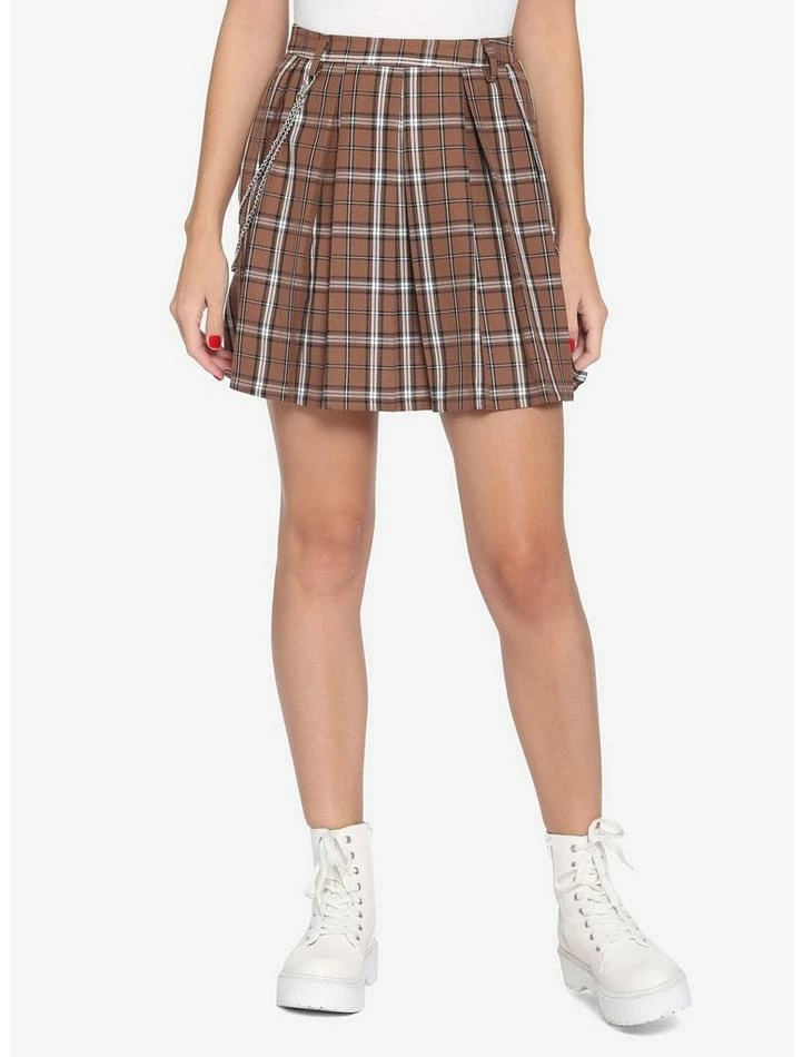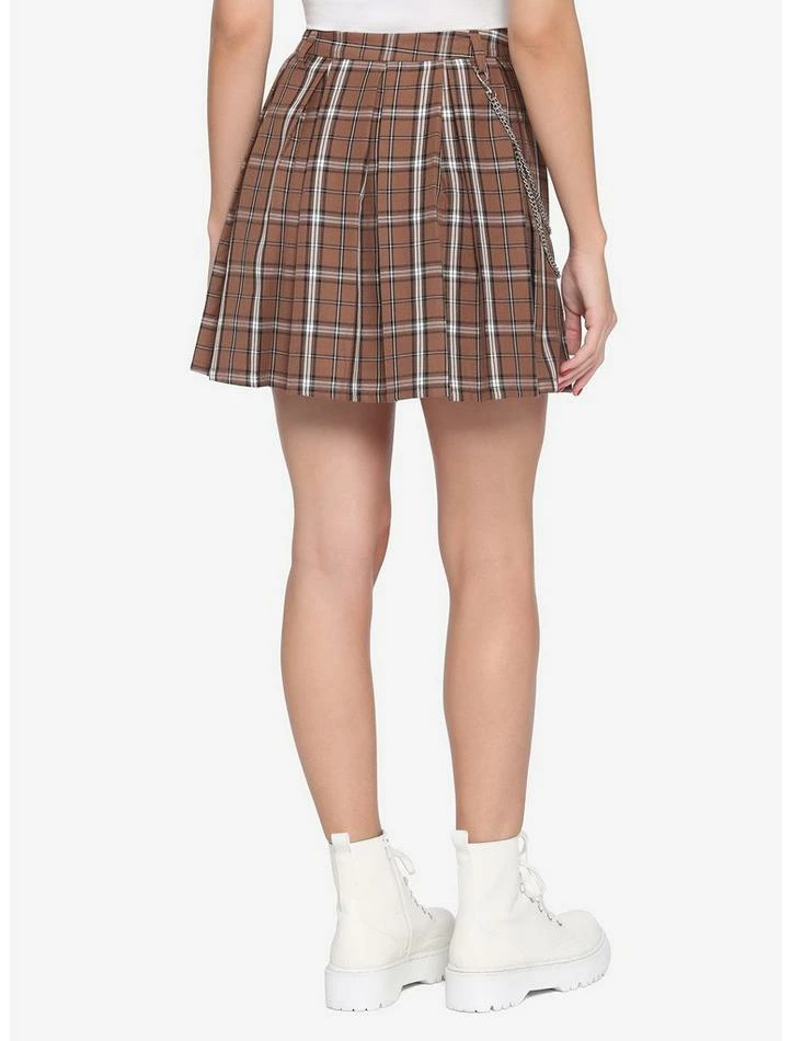 Meet your new fall go-to piece! This skirt features a brown, white and black plaid pattern, pleats, side zipper closure and removable silver tone chain.