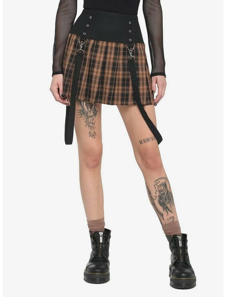 Mix up your daily skirt rotation with this brown plaid style. It features grommets waist band, pleats and removable suspenders.