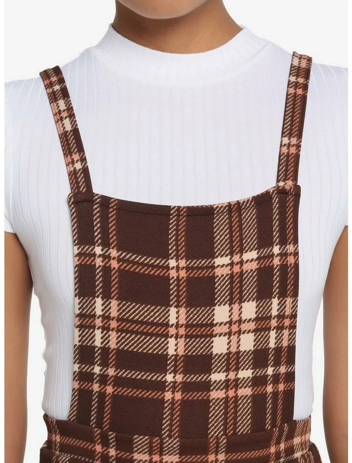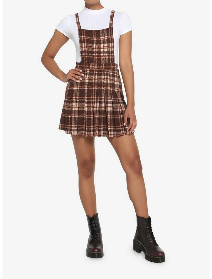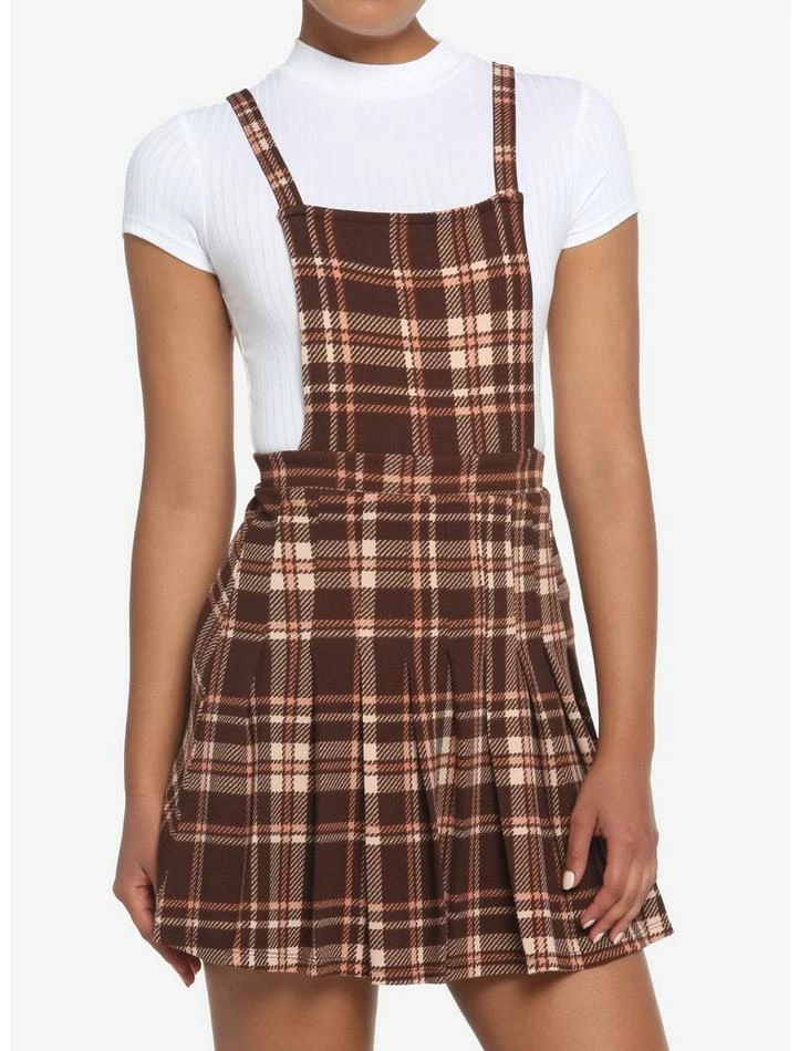 Make plaid your go-to pattern in this twofer dress featuring a brown plaid skirtall with pleats and a white top.