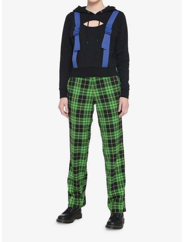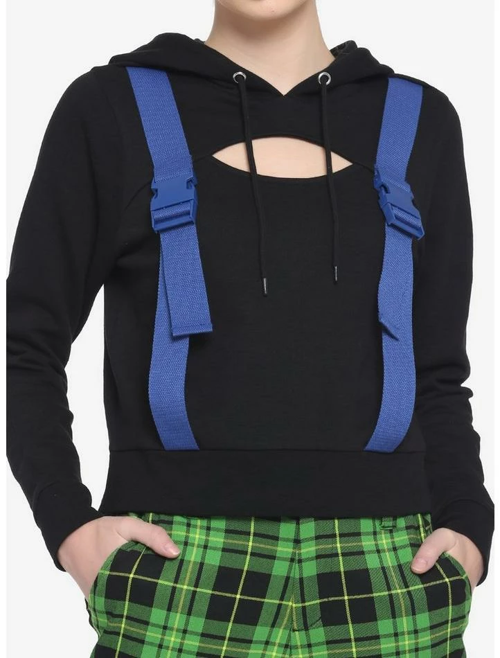 We’re kicking your hoodie game up a notch! Keep your streetwear look comfy and fashionable with this cropped hoodie, featuring a cutout opening at the chest and decorative blue buckle hardware straps on the front and across the back. Comes with a hood and drawstring cords.