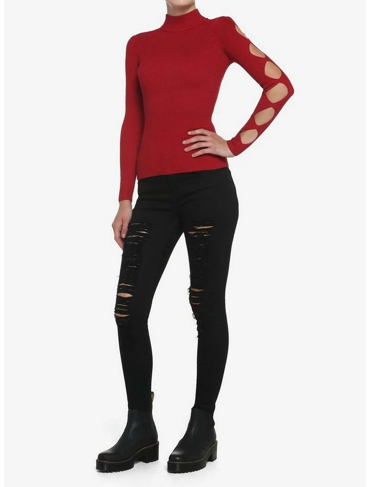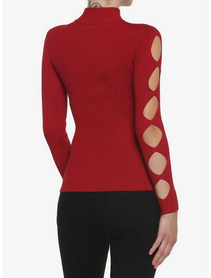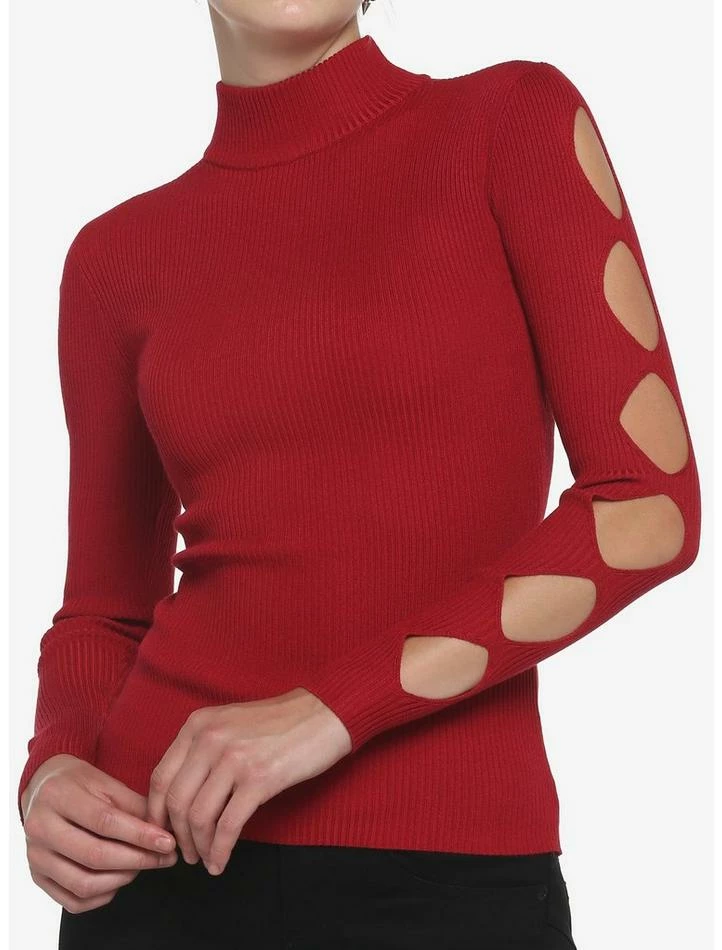 Get cozy, but keep it classy in this burgundy long-sleeve top! This ribbed top features a mock neck and argyle-shaped cutout detailing down the sleeves.