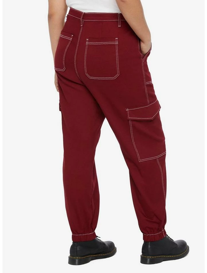 Cargo jogger pants combine the best of both pants styles. This pair is burgundy with white contrast stitching, with cargo style pockets, elastic jogger-style ankles and a removable side chain.