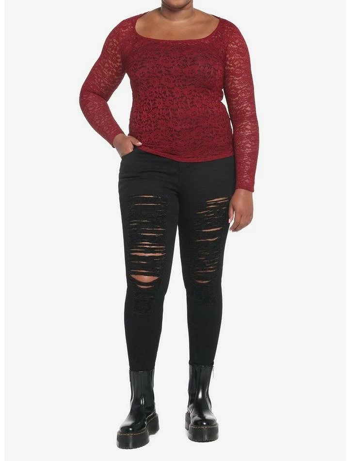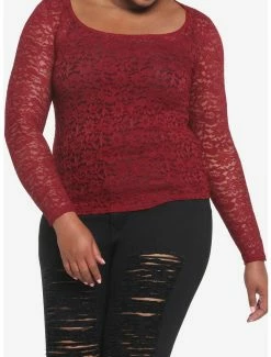 Your look is in bloom! This long-sleeve top features a sheer burgundy floral design.