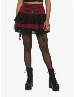 Pull up to the function in this tiered skirt full of edgy details. It’s decorated with black lace tiered, grommet taping and faux buckles on the front waist.
