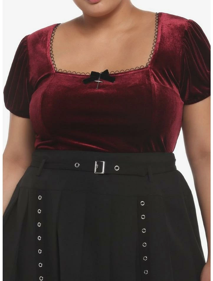 Dreaming of a vampire to sweep you off your feet? You must have the perfect outfit for the occasion. Try this velvet top, which has puff sleeves and scalloped neckline detail, with a ribbon and cross on the chest.