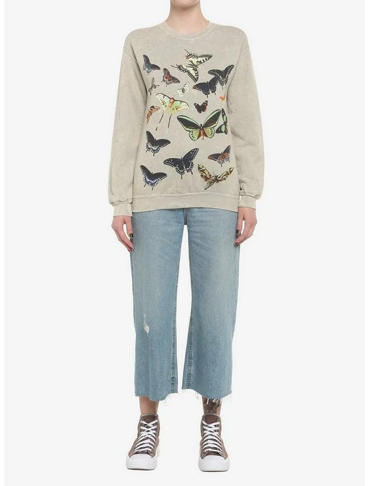 The beauty of butterflies never fades. This slightly oversized crewneck sweatershirt shows off some seriously gorgeous pollinators against a neutral mineral wash for overall dreamy look.