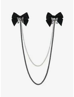 Make your hairdo look all aflutter with this macabre hair bow set! Featuring black hair bows adorned with skull and butterfly wing charms, attached by silver-tone and black chains.