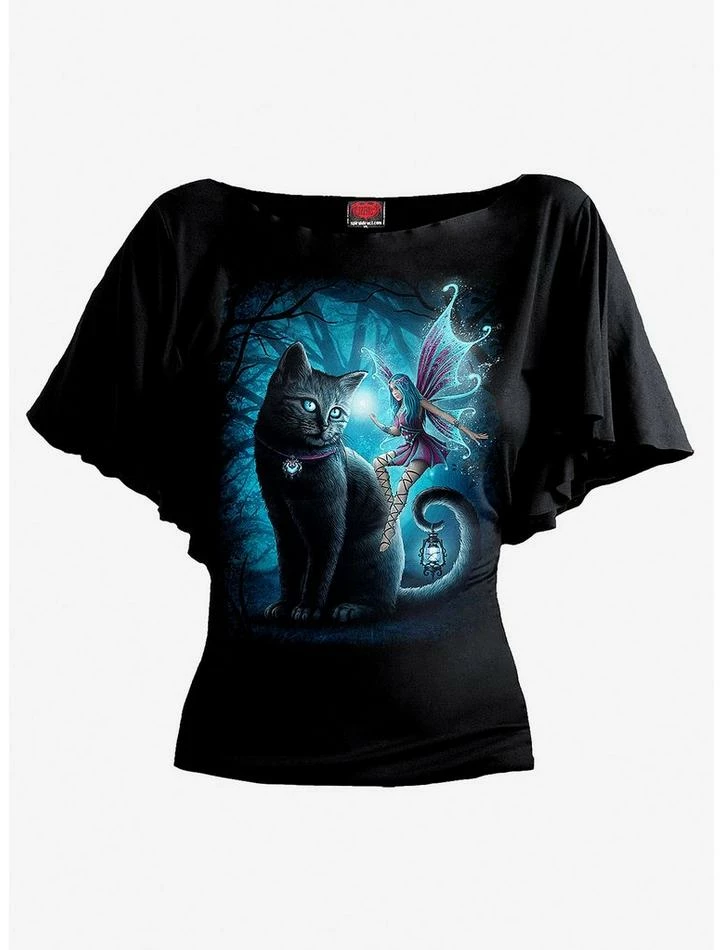 A loyal black cat holds a blue lantern on her tail, lighting the way for her fairy companion in their journey through the enchanted forest. This top is made of jersey using skin friendly, Azo-free, reactive dyes.