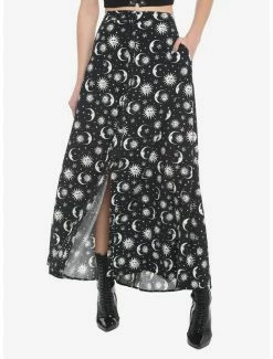 Take your next ‘fit to mystical levels with this maxi skirt. It has an allover print of suns and moons with faces, and plenty of stars. It also has pockets and a button-front.